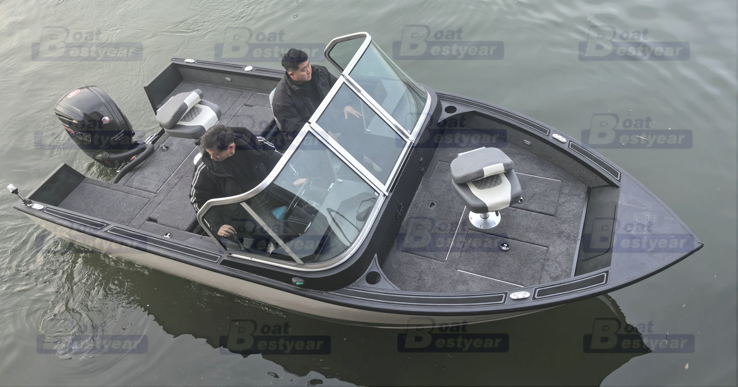 Bestyear Aluminum FB500G Fishing Boat length 5m,width 2.26m windscree Twin helmsman seats and twin passenger seats Marine Carpet deck living fishing storage and bait storage cup holders folding type cleats fender whole welded fishing seat Bilge pump